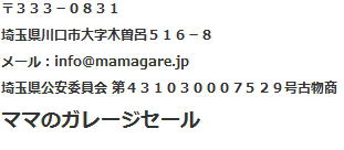 【通信販売業務の責任者名】土橋 智英子 【古物商許可証】 埼玉県公安委員会許可第431030007259号 【住所】 埼玉県 川口市 木曽呂516-8 【電話番号】            048-297-7581 【携帯】 090-4960-2850(24Hお電話受け付けます) 【営業時間】 【定休日】 下の欄をご覧ください。